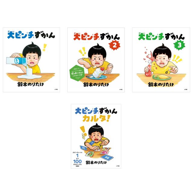【セット内容】 ●大ピンチずかん ●大ピンチずかん2 ●大ピンチずかん3 ●大ピンチずかんカルタ! ●大ピンチずかん もういつピンチが来ても大丈夫だ! 大ピンチを知れば、いつ大ピンチになってもこわくない。 この図鑑は、こどもが出あう世の中のさまざまな大ピンチを、「大ピンチレベル」の大きさと、5段階の「なりやすさ」で分類し、レベルの小さいものから順番に紹介します。また、その大ピンチの対処法や、似ている大ピンチ、大ピンチからさらにおそいかかる大ピンチなど、あらゆる方向から 大ピンチを ときあかします。 ・・・などといえば、かたい本に聞こえますが、もちろんそうではありません。期待を裏切らない「のりたけワールド」炸裂で、鋭くもあたたかい観察眼と、思わずふき出すユーモアにあふれた1冊です。 【判型・ページ数】B20取/48頁 【ISBN(JAN)】9784097251385 【発売日】2022年02月16日 ●大ピンチずかん2 大ピンチグラフ採用で大ピンチが丸わかり! 子どもが大ピンチに陥ってしまったとき、その大ピンチの理由がわかれば、そんなにおそれることはない。進化した『大ピンチずかん2』では、子どもが陥りやすい大ピンチを、大ピンチレベルの順に掲載するのはそのままに、新たに採用した「大ピンチグラフ」で、6つの要素からその理由を解明する。さてきみの大ピンチの原因はなんだろう?ドキドキ?イライラ?それともつらい? 【判型・ページ数】B20取/48頁 【ISBN(JAN)】9784097252436 【発売日】2023年11月22日 ●大ピンチずかん3 新機軸うっかりメーターで大ピンチを考える 大ピンチは思いがけない理由でやってくる。 『大ピンチずかん3』では世の中のさまざまな大ピンチを、大ピンチレベルの大きさと今回初登場の「うっかりメーター」で表し、レベルの小さいものから順番に紹介する。 ついうっかりしたことで大ピンチに陥ったのなら、それはまさに自分のせい。次に大ピンチにならないように考えることができるぞ。 また大ピンチ調査や大ピンチを乗り越える方法など、知りたい情報も新たな切り口で掲載。さらに進化した 『大ピンチずかん3』。3冊揃えて手元に置いておけば、もう安心だ。 【判型・ページ数】B20取/48頁 【ISBN(JAN)】9784097254010 【発売日】2025年04月10日 ●大ピンチずかんカルタ! 『大ピンチずかん』がカルタになった! 「大ピンチずかん」シリーズ3作から大ピンチレベル1〜100までの大ピンチを選定!100枚の絵札に100枚の読み札で200枚の大ボリューム。絵札には絵本でおなじみのピンチのイラストが大きく入り、裏面には大ピンチレベルの数字を記載。大ピンチは大ピンチレベル1~100まで各ひとつずつあるので、カルタ遊びの他にもいろいろなオリジナルの遊びができそうだ。そして読み札の裏には絵合わせパズルが。何のイラストが描いてあるかは実際にやってみてからのお楽しみ。絵本のファンならずとも、子どもから大人まで楽しめる嬉しい逸品となりました。 【判型】A6変 【ISBN(JAN)】9784099425555 【発売日】2025年11月26日 【著者】 作:鈴木のりたけ