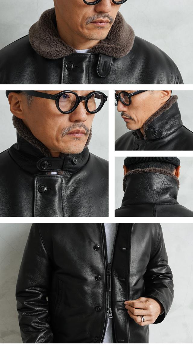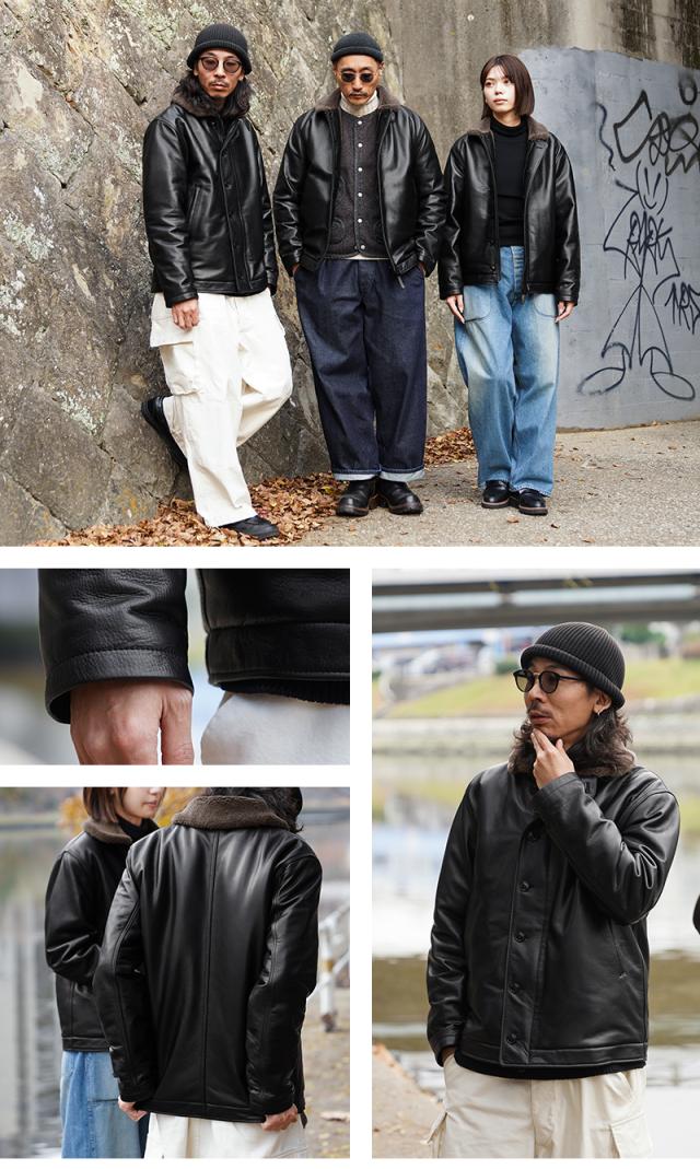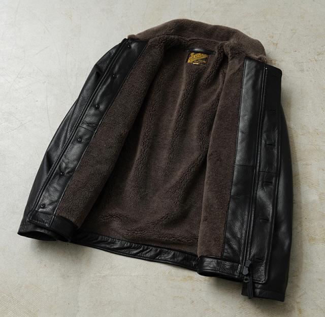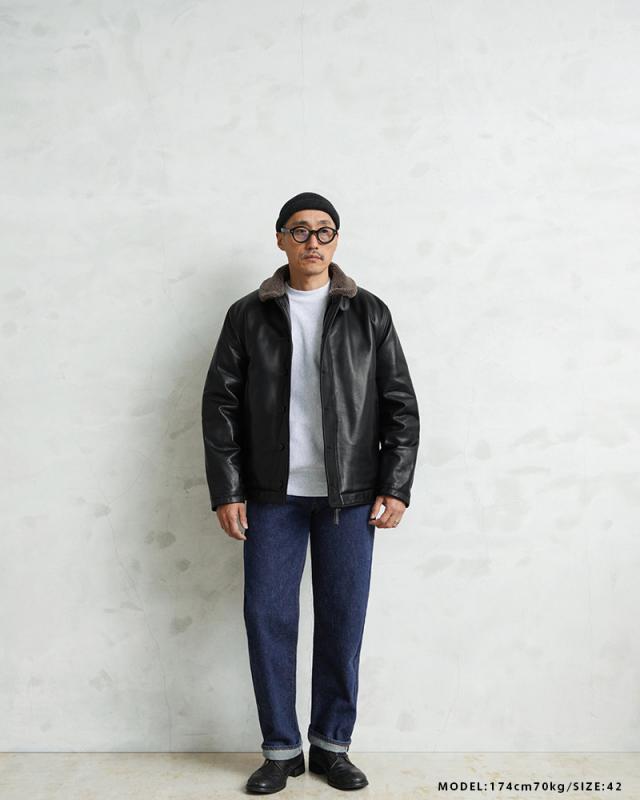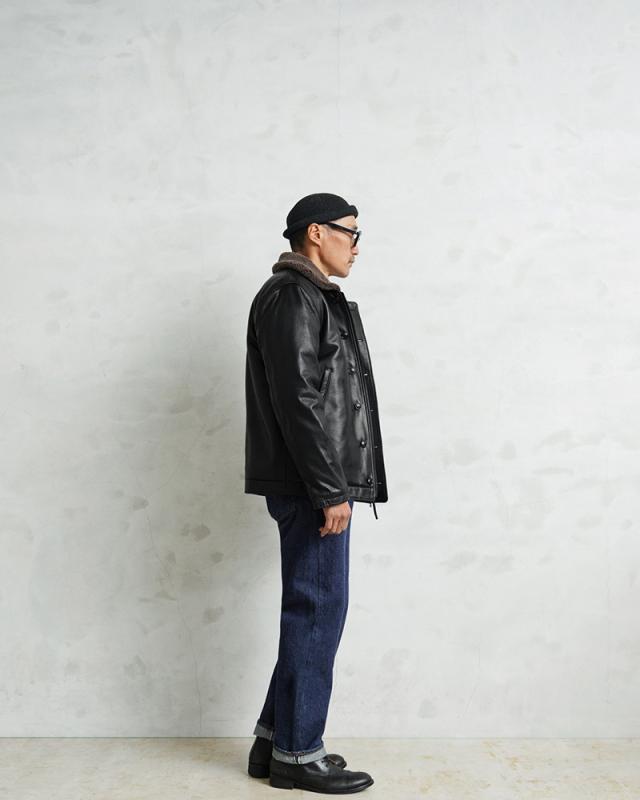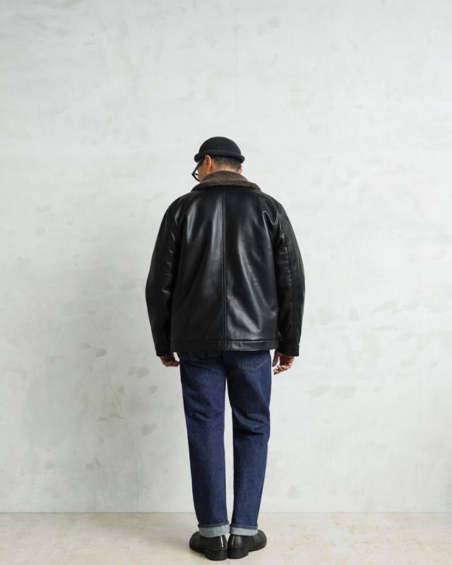 こちらは名作「N-1」をY’2LEATHERが誇る熟練の職人技と上質なステアハイドで仕上げたスペシャルな別注アイテムです。染色には”水染め”という技法を使用しています。専用のドラムの中で水と油と染料を混ぜたものにつけこみ、ゆっくり、しっかり油と色を入れていくことで革はやわらかい仕上がりに。時間と手間がかかりますが、上質な着心地と強度を持ち合わせた最高の一着に仕上がっています。
