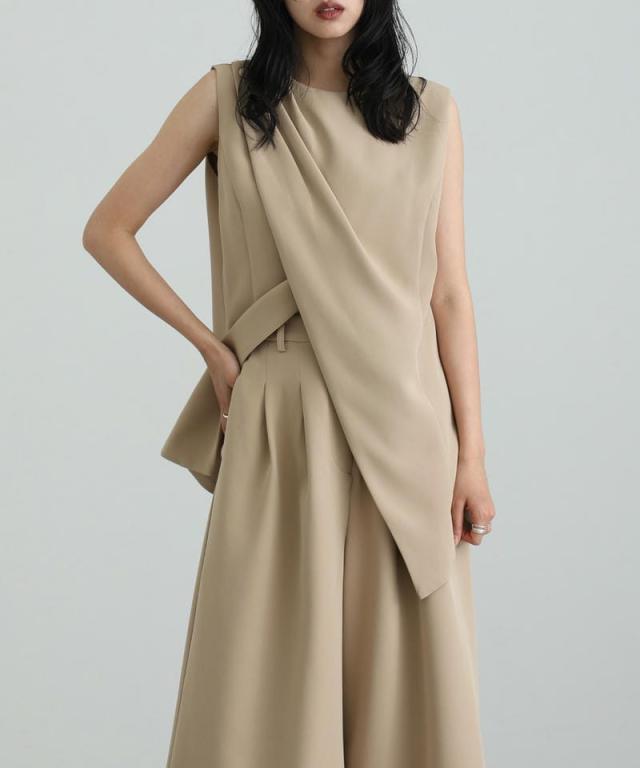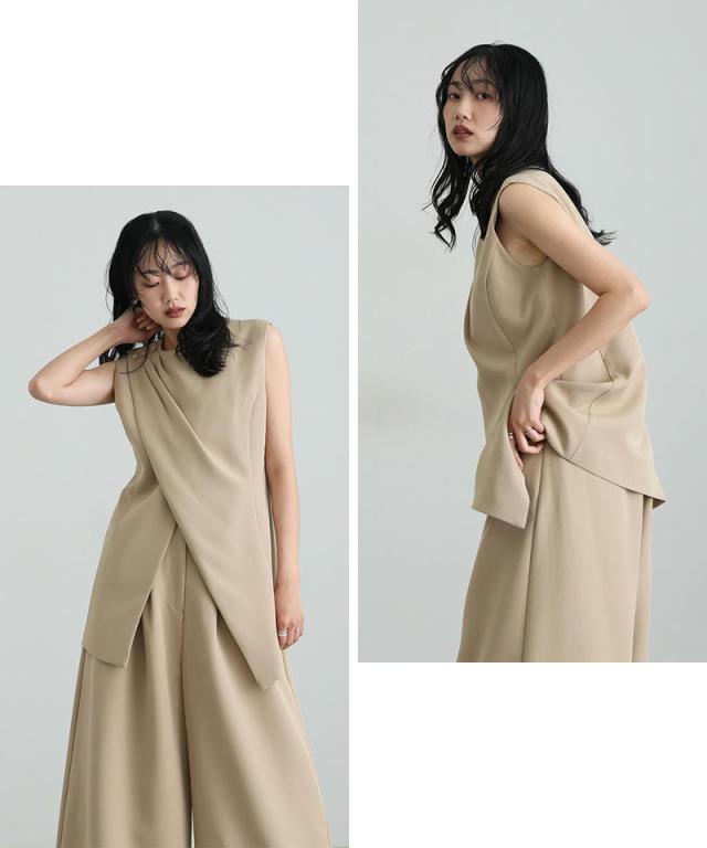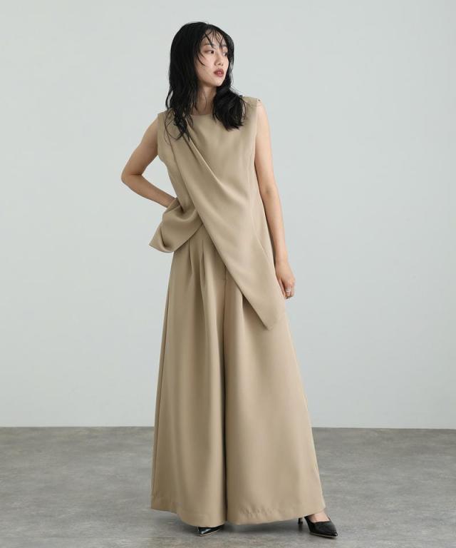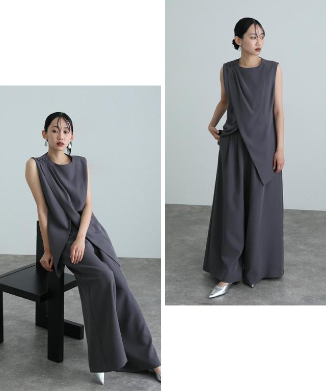 動きのあるドレープトップスとワイドパンツを組み合わせた、洗練セットアップ。