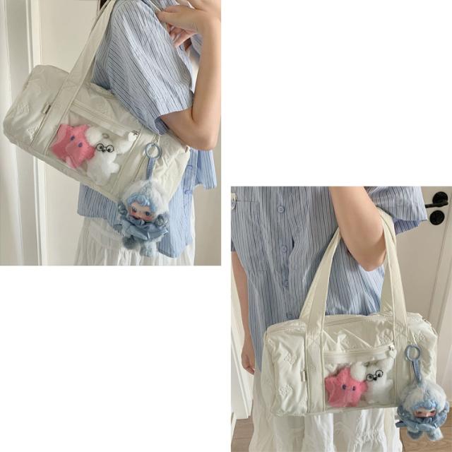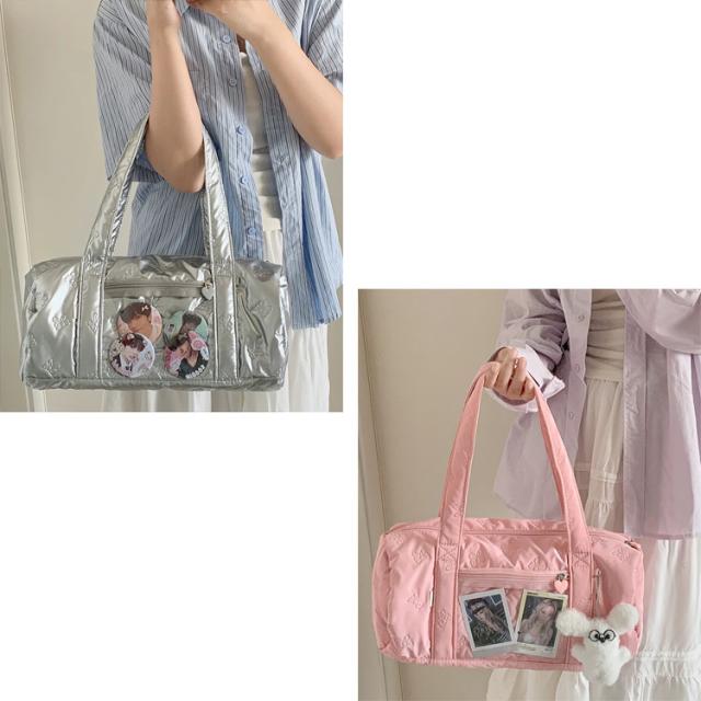 全品送料無料一部除く リボンキルティング クリアポケット付き ボストンバッグ【即納】オタ活 推し活コーデ 鞄 カバン かばん ハンドバッグ 肩掛けバッグ 痛バッグ 痛バ 見せバッグ 透明 缶バッチ 缶バッチ付き キーホルダー レディース 韓国 流行り トレンド かわいい