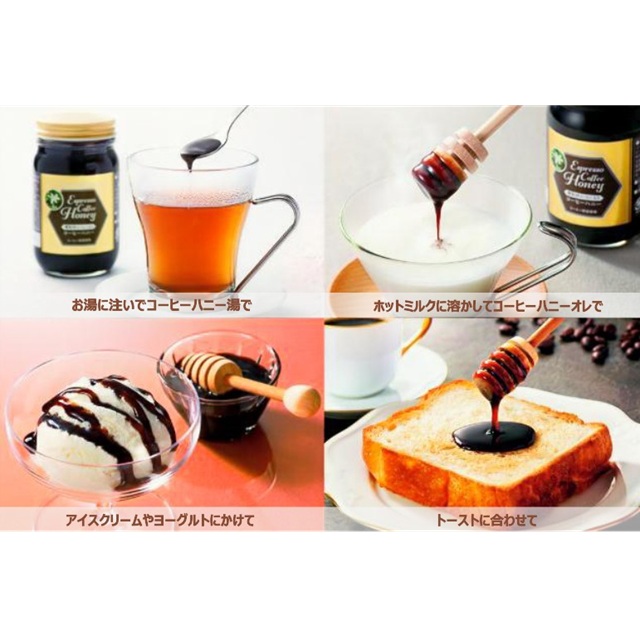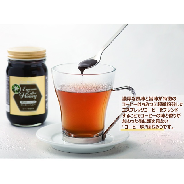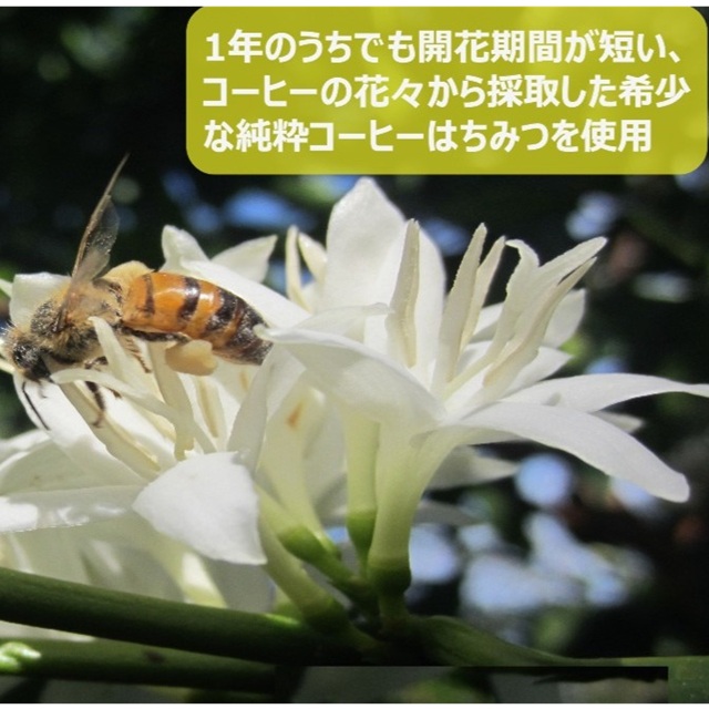 1年のうちでも開花期間が短い、コーヒーの花々から採取した希少な純粋コーヒーはちみつに超微粉砕した深煎りコーヒー(エスプレッソコーヒー)をブレンドしたプレミアムコーヒー味はちみつです。