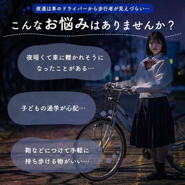 車のライトなど当たればそれを反射し、暗い中でもキラッと明るく見えるので、自分の居場所をドライバーにアピールすることができます。