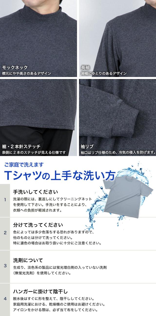 | 【ジャケットのインナーの為の両面起毛モックネック長袖Tシャツ】 両面起毛生地を使用したモックネック長袖Tシャツは、肌に触れた瞬間からやさしい暖かさを感じられる一枚です。表側・裏側ともに起毛加工を施しているため、空気をたっぷり含み、保温性に優れながらも軽やかな着心地を実現しています。首元は程よく立ち上がるモックネック仕様で、冷えやすい首周りをさりげなくカバーしつつ、タートルネックほどの締め付け感がないため快適に着用できます。伸縮性のある素材を採用しているので動きやすく、インナーとしてジャケットやアウターの中に合わせてもごわつきにくいデザインです。シンプルで合わせやすく、秋冬のデイリーコーデから通勤スタイルまで幅広く活躍する、暖かさと実用性を兼ね備えた長袖Tシャツです。 |
