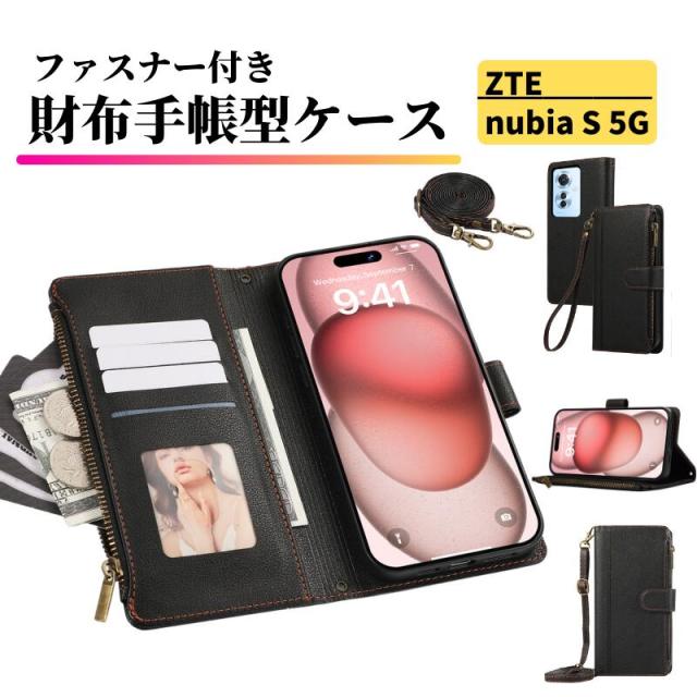 nubia S 5G ケース 手帳型 レザー お財布 ショルダー カードケース 軽量 カード収納 ストラップ 2種付 耐衝撃 スマホケース カバー 男女兼用 ZTE A403ZT ブラック