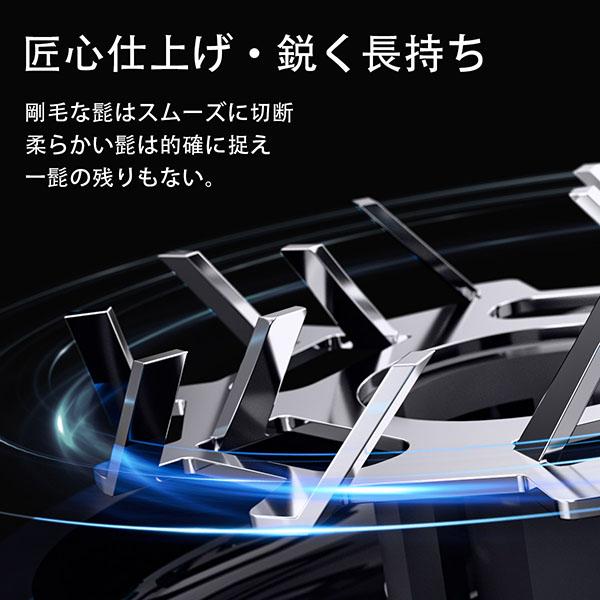 ・【2段階調整・効率シェービング】 8500回転/分の「ソフトモード」は細いヒゲや敏感肌に。9500回転/分の「パワフルモード」は硬いヒゲも逃さず、顎下までスピーディーに深剃り。
