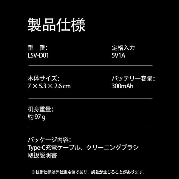 ブランド:TOKAIZ Lite 型番:LSV-D01 本体重量:約97g 回転数:8500RPM(ソフト) / 9500RPM(パワフル) ヘッド:マグネット式着脱ヘッド(水洗い可) 調整:2段階調整モード搭載 |