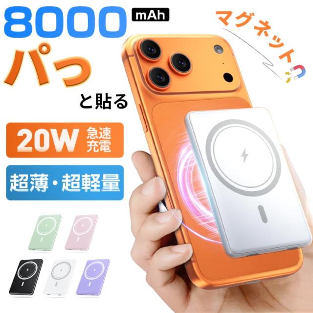 ★新作SNS話題★モバイルバッテリー マグネット式ワイヤレス充電対応 8000mAh コンパクト 急速充電 magsafe ワイヤレス 充電 大容量 軽量 小型 薄型 残量目安デジタル表示 PSE認証 スマホ充電器 iPhone Android対応
