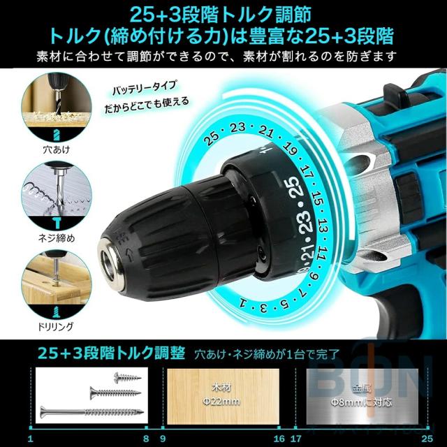 電動ドライバー セット 充電式 電動 ドライバー 小型 コードレス コンパクト 18V 最大50N.m 2Way 電源に対応 25+3段階トルク調節 スピード調節機能