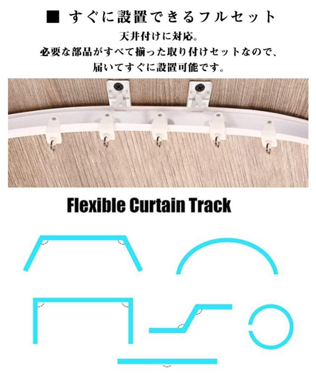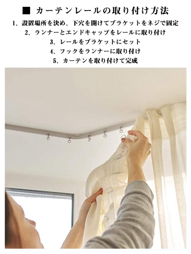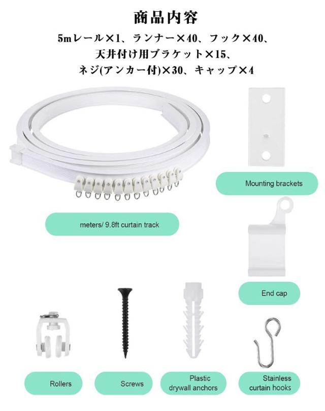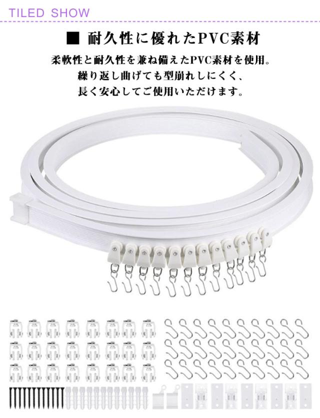 | どんな場所にもフィット! 「自由自在」に曲がる 5m カーテンレール 商品内容:5mレール×1、ランナー×40、フック×40、天井付け用ブラケット×15、ネジ(アンカー付)×30、キャップ×4 ■ 自由に曲がる・自由にカット(全長5m) 必要な長さに合わせて簡単にカット可能。 さらに、お好みの角度に自在に曲げられるため、 出窓・R型の壁・コーナー部分など、一般的なレールでは対応しづらい場所にもぴったりフィットします。 アイデア次第で、空間づくりの幅が広がります。 ■ スムーズ&静かな快適開閉 ・スムーズな開閉 ランナーの取り付け部には2つのローラーを採用。軽い力でスーッと滑らかに動きます。 ・静音設計 ランナーにはレール外部と同じABS樹脂を使用。開閉音が静かで、快適にお使いいただけます。 ■ 耐久性に優れたPVC素材 柔軟性と耐久性を兼ね備えたPVC素材を使用。 繰り返し曲げても型崩れしにくく、長く安心してご使用いただけます。 ■ すぐに設置できるフルセット 天井付けに対応。 必要な部品がすべて揃った取り付けセットなので、届いてすぐに設置可能です。 ■ シンプルでお部屋に馴染むデザイン 無駄のないシンプルデザインで、インテリアの邪魔をしません。 リビング・寝室・キッチン・オフィスなど、さまざまな空間に自然に馴染みます。 ■ カーテンレールの取り付け方法 1、設置場所を決め、下穴を開けてブラケットをネジで固定 2、ランナーとエンドキャップをレールに取り付け 3、レールをブラケットにセット 4、フックをランナーに取り付け 5、カーテンを取り付けて完成 | |