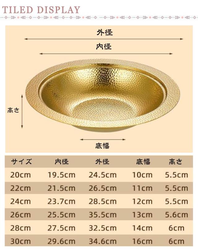 | サイズについての説明 | 【サイズ】 【26cm】内径25.5cm 外径35.5cm 底幅13cm 高さ5.6cm 【28cm】内径27.5cm 外径32.5cm 底幅14cm 高さ6cm 【30cm】内径29.6cm 外径34.6cm 底幅16cm 高さ6cm ※上記サイズは平置き実寸になります。サイズ表の実寸法は商品によって1-3cm程度の誤差がある場合がございます。 |