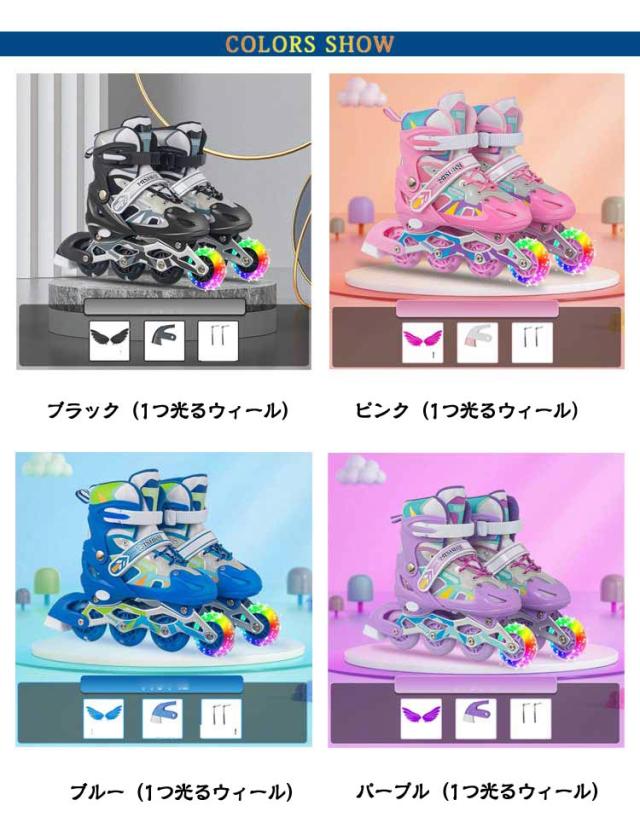 | 【インラインスケート 18−26cm ウィールが光る サイズ調節可能】 足元が映える全ホイールが光るインラインスケート。 簡単にサイズの調節ができ、成長過程の子どもが長い間履き続けられます。 つま先が高強度素材を採用し、つま先はがっちり全方位ガード。 耐摩耗性PVCホイール、高反発でターンも決めやすく、滑りも静かでなめらか摩耗しにくい。 厚いパッドは、痛みを防ぐための足首を保護します。やわらかいスポンジ素材を使用し、着心地が良いです。 フレームは強化アルミニウム合金で作られ、厚みのあるフレームはより安全で安定したスケート体験をもたらします。 | |
