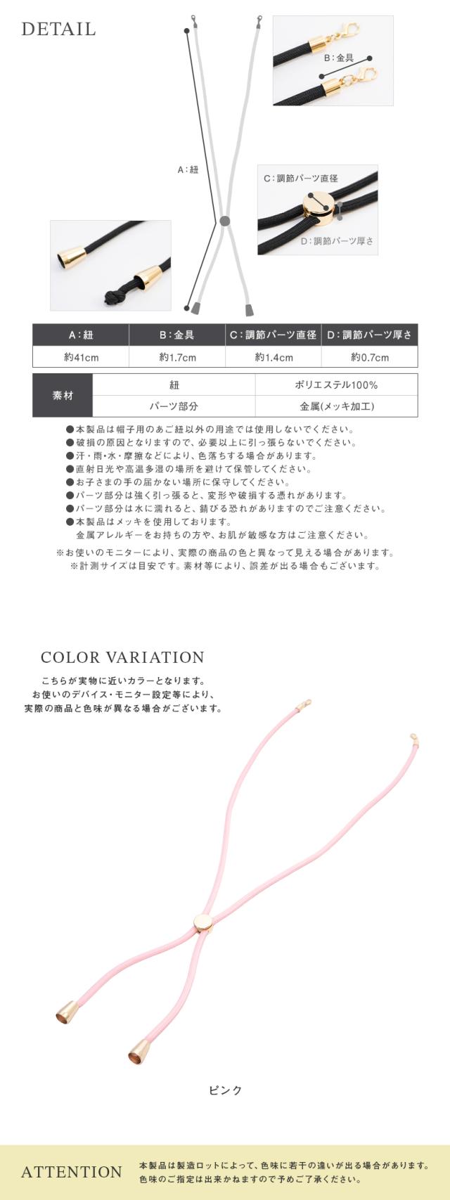 | 注意 | ・本製品は帽子用のあご紐以外の用途では使用しないでください。 ・破損の原因となりますので必要以上に引っ張らないでください。 ・汗・雨・水・摩擦などにより、色落ちする場合があります。 ・直射日光や高温多湿の場所を避けて保管してください。 ・お子さまの手の届かない場所に 保管してください。 ・パーツ部分は強く引っ張ると変形や破損する恐れがあります。 ・パーツ部分は水に濡れると、錆びる恐れがありますのでご注意ください。 ・本製品はメッキを使用しております。金属アレルギーをお持ちの方やお肌が敏感な方はご注意ください。 |