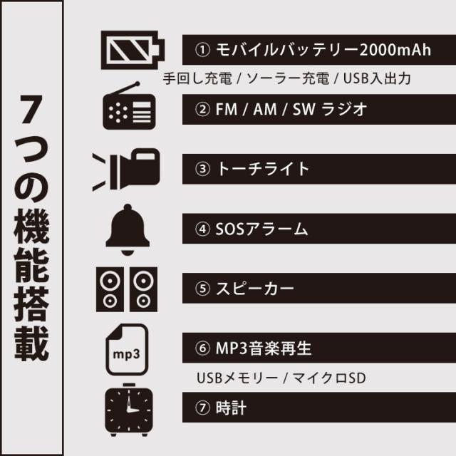 (1)モバイルバッテリー2000mAh: 手回し充電+ソーラー充電+USB充電 (2)FM/AM/SW ラジオ: 災害時はもちろん日常のラジオとしても (3)トーチライト: LED懐中電灯。停電時や読書灯としても (4)SOSアラーム: 災害時、避難や避難先で大きな音を出す防犯アラーム (5)スピーカー: Bluetooth/AUX接続 (6)MP3音楽再生: オーディオ端末のスピーカーとして (7)時計 |