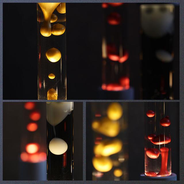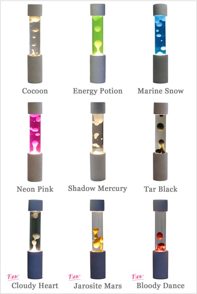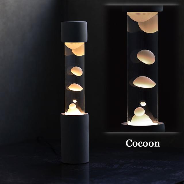 点灯すると呼吸をするように流動的に形を変えながらコンクリートの筒を行き来するラバランプ。 間接照明としてはもちろん、ずっと見ていても飽きないインテリアしても活躍してくれます。 商品がお手元に届いた時は、液体が下に沈殿していますが、電源を入れると少しずつ動き出しますので、しばらく時間を置いてお待ちください。 「Cocoon」「Shadow Mercury」「Cloudy Heart」の違いが写真では分かりにくいですが、下記を参考にしてください。 Cocoon:液体は透明で、ワックスはホワイト Shadow Mercury:液体が少し暗い色で、ワックスはシルバー Cloudy Heart:液体は黒で、ワックスはホワイト |