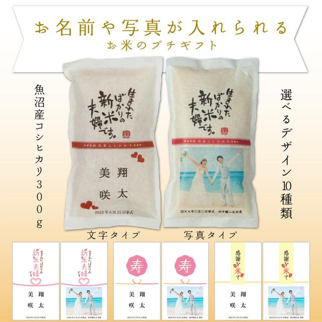 新潟コシヒカリの美味しいお米300g入り。ラベルにご夫婦のお名前や写真・記念日などが入れられます