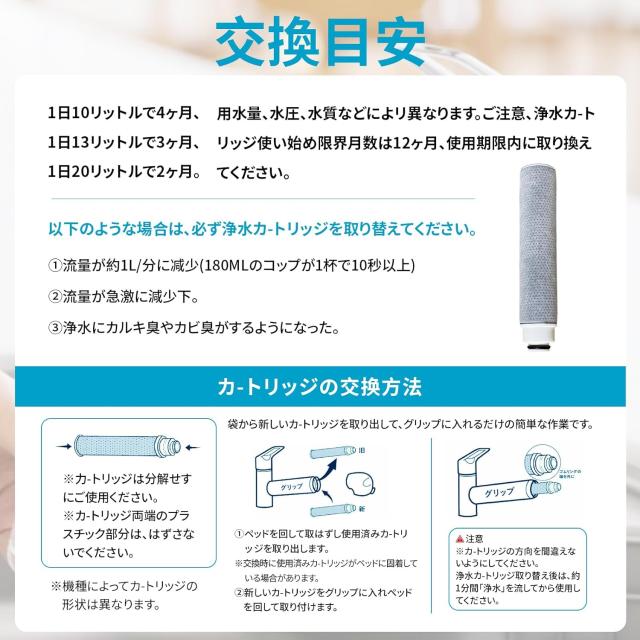 ※交換時期は使用水量、水質、水圧などによって異なります。 以下のような場合にも、新しいカートリッジに交換してください。