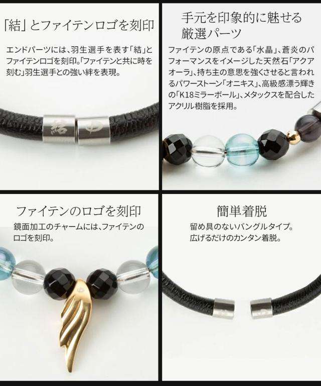 ファイテンの原点である「水晶」、蒼炎のパフォーマンスをイメージした天然石「アクアオーラ」、持ち主の意思を強くさせると言われるパワーストーン「オニキス」、高級感漂う輝きの「K18ミラーボール」、メタックスを配合したアクリル樹脂を採用。