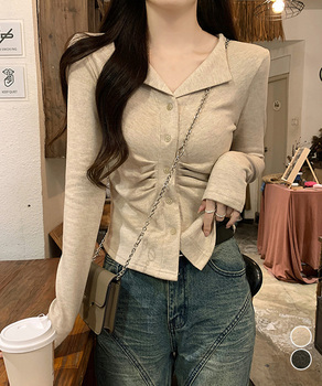 大人カジュアル 襟付きトップス着やせ レディース 可愛いフロントボタン リブ編みカットソー ショート丈細見えTシャツ秋冬シャツ襟春秋服長袖 タイトトップス無地 服
