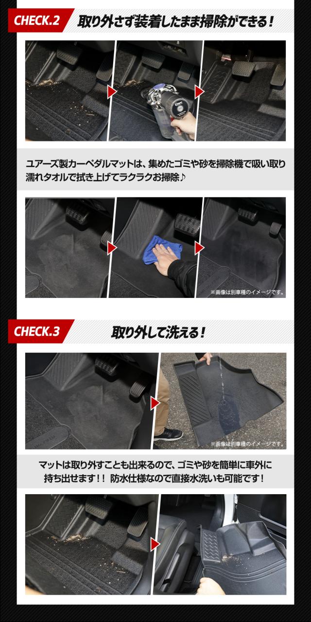 ・フロアをスキャンして製作しているのでピッタリフィット! ・付属のマジックテープで固定するので運転中にマットは全くズレません! ■純正マットの端から落ちるゴミや砂をガッチリガード!! ・隙間なくフィットするので、ゴミや砂が直接車両床に落ちることはありません。 ・3Dデザインなので縁の数センチの立ち上がりで水や汚れをしっかりキャッチ! ■完全防水なのでお手入れも簡単! ・水や汚れは軽いものならウエスなどで拭くだけでOK! ・全面的に汚れた場合は丸洗いも可能なので衛生的です。 ■新素材の熱可塑性エラストマー(TPE)を使用。 ・弾力があり、曲げたりすることも可能なので、お車からの取り外しも容易です。 ・ゴムのように車内が臭くなりません。 ・耐久性抜群なので何十万キロ走っても大丈夫です。 |