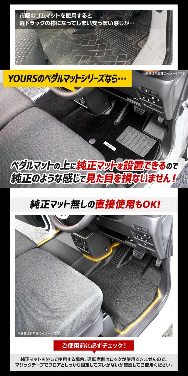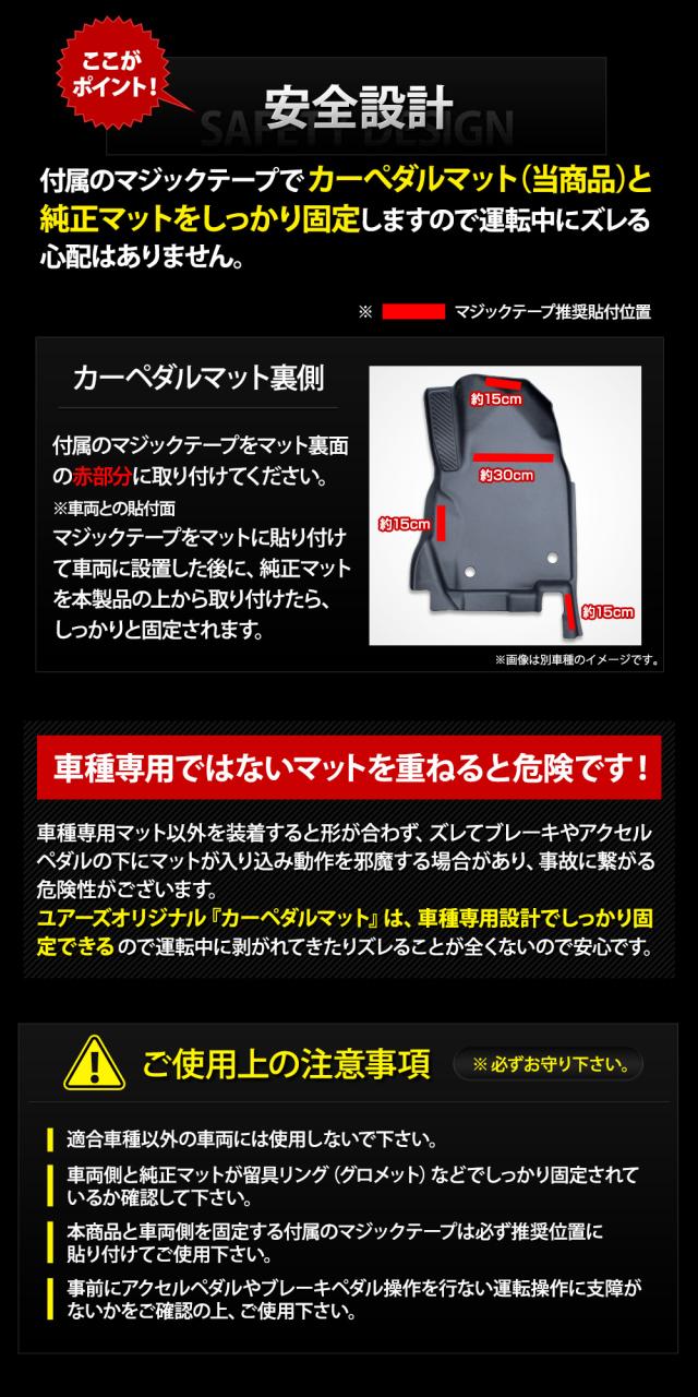 ■元に戻りやすい素材ですので、到着時に型が付いている場合は平らな場所で数日置いてください。それでも戻らない場合は、ドライヤー温風を当てながら手で反対側に丸めて調整してください。 ■適合車種以外の車両には使用しないで下さい。 ■車両側と純正マットが留具リング(グロメット)などでしっかり固定されているか確認して下さい。 ■純正マットを装着せずに使用する場合は、必ず本製品裏面の推奨位置にマジックテープを貼り付けて、車両と本製品を固定させてズレがないかご確認の上、ご使用ください。 ■事前にアクセルペダルやブレーキペダル操作を行ない運転操作に支障がないかをご確認の上、ご使用下さい。 |