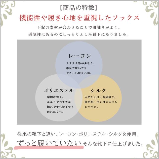 シルク混素材でしっとりなめらかな履き心地のレディースソックス。 通年使えるハイクルー丈で、冷え対策にもおすすめ。 シンプルでおしゃれなデザインは通勤・通学・室内履きまで幅広く活躍します。 多機能で使いやすく、通年お使いいただけます。 |