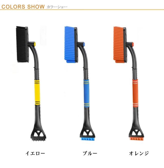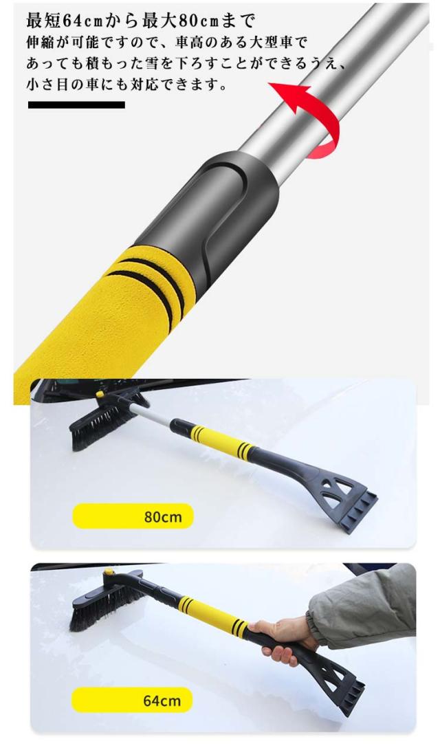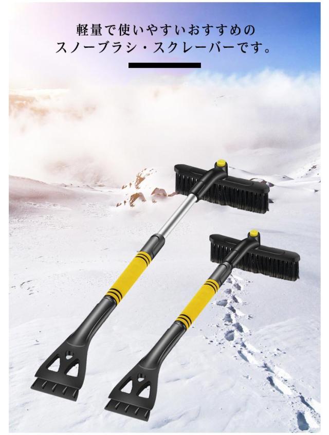 | 組立式スノーブラシ。 軽量で使いやすいおすすめのスノーブラシ・スクレーバーです。 スノーブラシとアイススクレーパーの二つの機能が搭載されており、用途に合わせた使用ができます。またスノーブラシとアイススクレーパーは取り外せるため、保管も簡単です。 最短64cmから最大80cmまで伸縮が可能ですので、車高のある大型車であっても積もった雪を下ろすことができるうえ、小さ目の車にも対応できます。 持ち手にもグリップがついているため、素手での作業も可能です。 軽量なので、女性にも使いやすいです。 ロックインプッシュボタンにより簡単に組み立てできます。 | |