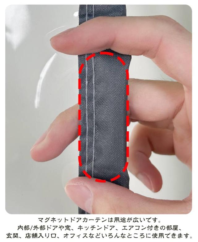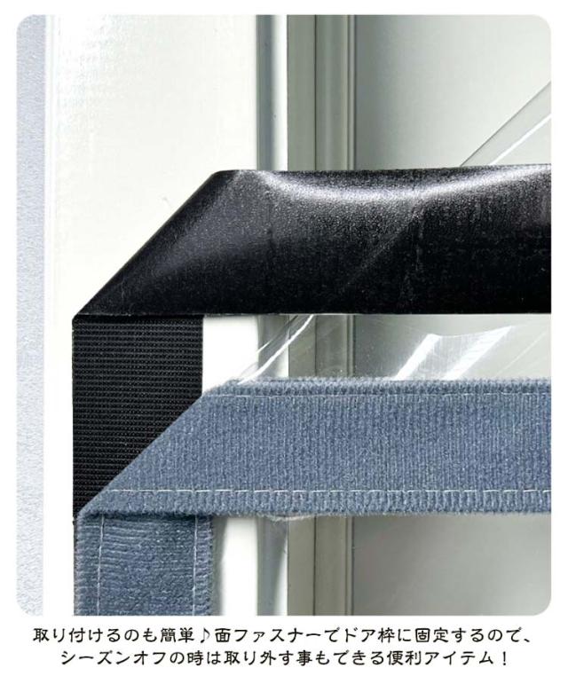 | 開け閉め・出入り楽ちんの玄関用断熱保温カーテン。 夏場はクーラーで冷えた空気を、冬場はストーブで暖まった空気を、 部屋の外に逃がさない磁石の力で閉まる間仕切りカーテンです。 部屋のドアを開けておきたいペットのいるご家庭にオススメです! 取り付けるのも簡単♪面ファスナーでドア枠に固定するので、シーズンオフの時は取り外す事もできる便利アイテム! マグネットドアカーテンは用途が広いです。内部/外部ドアや窓、キッチンドア、エアコン付きの部屋、玄関、店舗入り口、オフィスなどいろんなところに使用できます。 | |