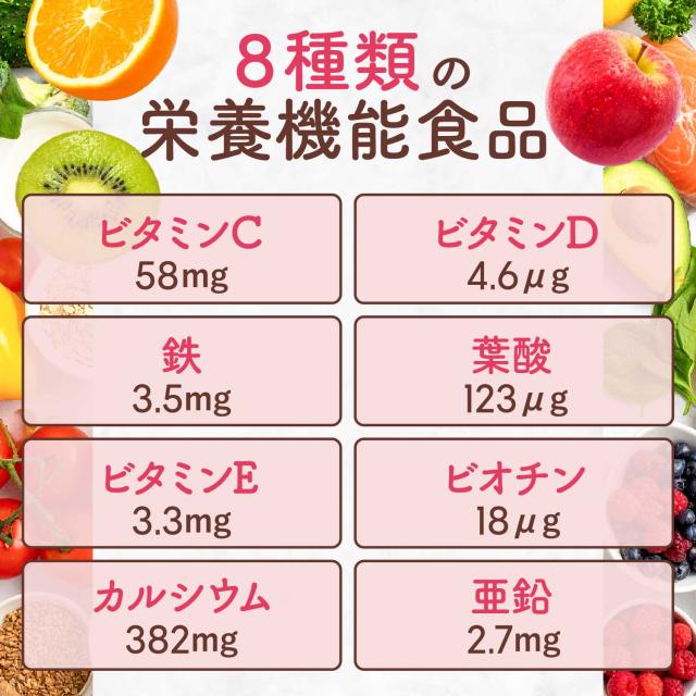 ・30〜49歳女性の食事摂取基準の1/3と比較してもほとんどが100%を超えており、ビタミンC・ビタミンD・ビタミンE・葉酸・ビオチン・亜鉛・カルシウム・鉄などの豊富な栄養成分を配合。