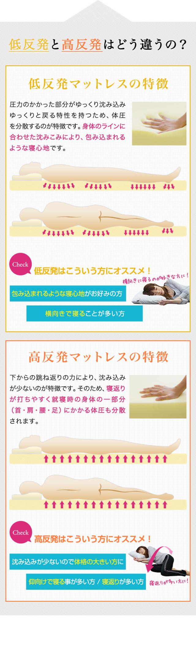 | 特記事項: ※圧縮梱包されたままの状態で長期間保管した場合、マットレスが復元できなくなってしまいます。商品到着後、1週間以内に必ず圧縮から開放をして頂くようにお願いします。 ※製品の臭いが気になりましたら、風通しの良いところで脱臭してください。この臭いは素材のウレタンによるもので無害です。臭いに敏感な方は十分ご検討の上、ご購入をお願いいたします。 ※マットの硬さは温度によって変わってきます。また、硬さの感じ方には個人差があります。 ※カバーは取り外して洗濯ができますが、マットレス本体は洗濯しないでください。 【硬さ(ニュートン)】の数値変更について 家庭用品品質表示法改正(2017年4月1日施行)に伴い、ページに表記しているマットレスの「硬さ(ニュートン)」の数値を従来の試験方法(D法)から新しい試験方法(A法)による数値に変更致しました。 ●130N(D法) ⇒ 150N(A法) ●160N(D法) ⇒ 180N(A法) ●180N(D法) ⇒ 200N(A法) ※表示する数値が変わるだけで製品自体の品質・性能は今まで通り変更ありません。 |