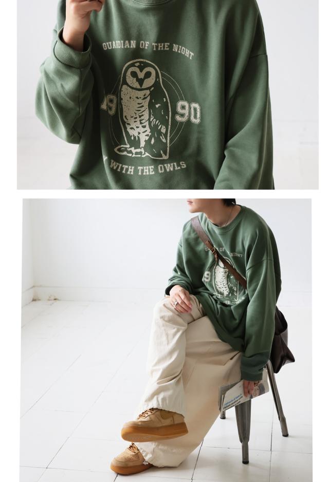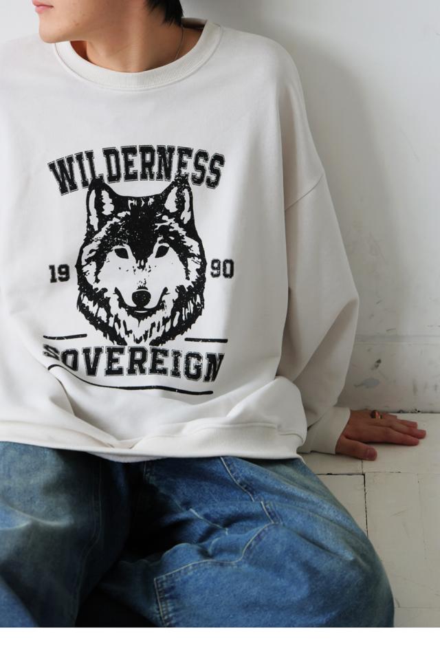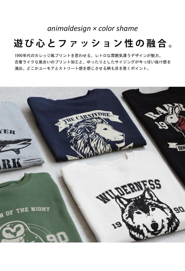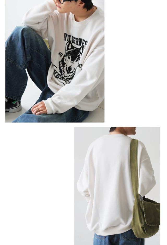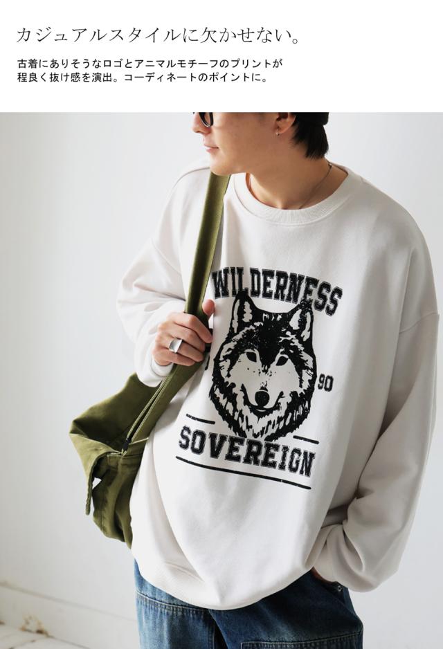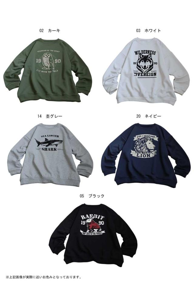 za-00301z トップス スウェット アニマル ロゴプリント クルーネック 長袖 ドロップショルダー ミドル丈 ワイド ルーズ 大きいサイズ ビッグシルエット カジュアル 古着風 ユニセックス