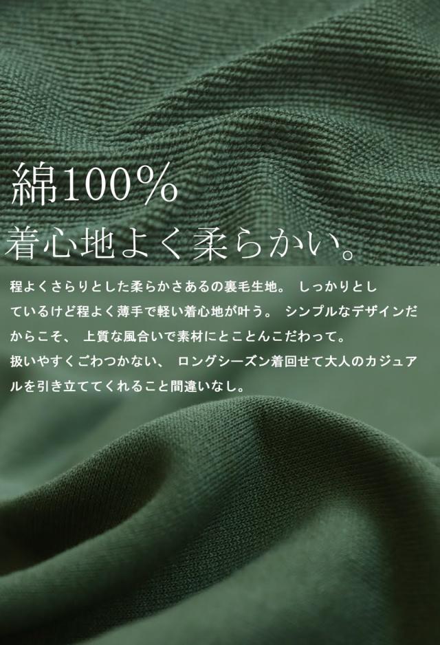 素材は綿100%の裏毛生地を使用し、やわらかな肌触りと通気性を兼ね備えた快適な着心地です。