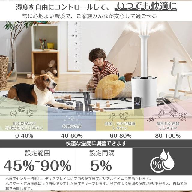 【知能恒湿機能&次亜塩素酸水対応&静電気/乾燥/花粉症対策】この業務用加湿器はお好み湿度恒定設置可能、目標湿度を45%から90%まで対応可能。65%湿度恒定設置おすすめ、冬場は特に乾燥を防ぐするごことができます、静電気の発生を抑えることができます。本加湿器は次亜塩素酸水(適量)も対応可能です。静電気、肌や喉の乾燥、花粉症の対策としての業務用加湿器です。
