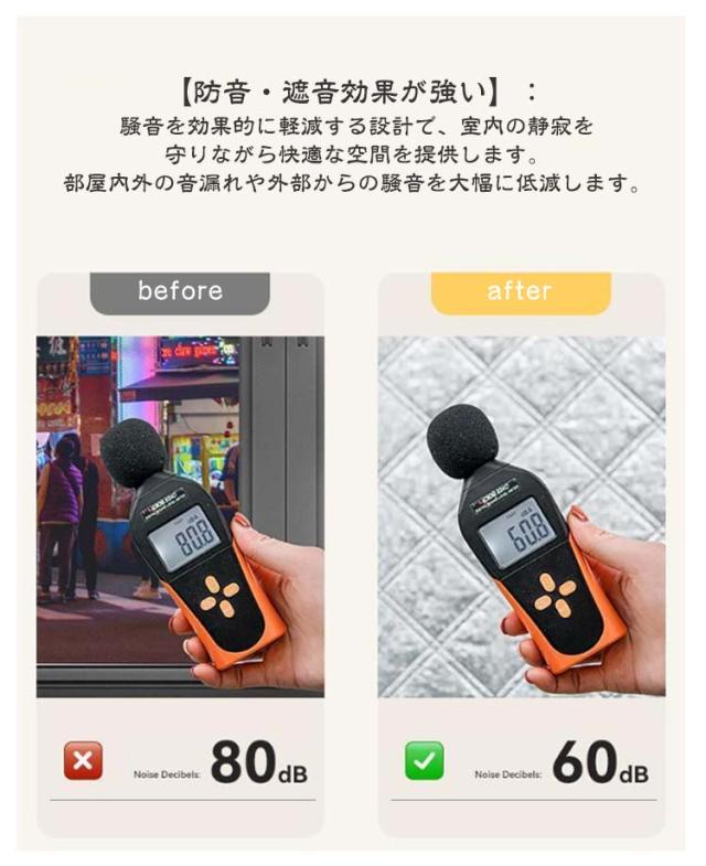 | 【防音・遮音効果が強い】:騒音を効果的に軽減する設計で、室内の静寂を守りながら快適な空間を提供します。部屋内外の音漏れや外部からの騒音を大幅に低減します。 【遮熱効果と完全遮光】:断熱層 騒音低減層 密閉層など多層構造で設計されており 効果的に熱伝導を遮断し 窓の隙間に起因する熱風と冷気の空気の損失を低減することができ 窓の断熱効果の大幅な向上により 室内冷暖房のエネルギー消費トを削減することができます。 【UVカット性能】:有害な紫外線を効果的にカットし、家具やカーペット、壁紙などを色あせから保護します。肌への影響も軽減します。 【装飾的】製品は ファッショナブルでシンプルなダイヤモンド格子モデリングを採用し 視覚効果はエレで寛大であり 一定の装飾的な美しさで さまざまなスタイルの室内環境とよく調和し 空間に多くのファッションの感覚を追加することができます。 【取り付け簡単&DIY対応】:特殊素材を使用し、誰でも簡単に取り付けられる設計です。工具不要で短時間で施工可能なので、手軽に始められます。 【適用範囲が広い】:ガラス、大理石、木材、ステンレス鋼の素材に対応しております。取り付け前に必ず壁面を清潔にしてください。 【節電対策・夏冬兼用】:季節を問わず活躍する窓断熱フィルムで、冷暖房の負担を減らし、省エネ生活をサポートします。経済的かつ環境に優しい選択です。 | |