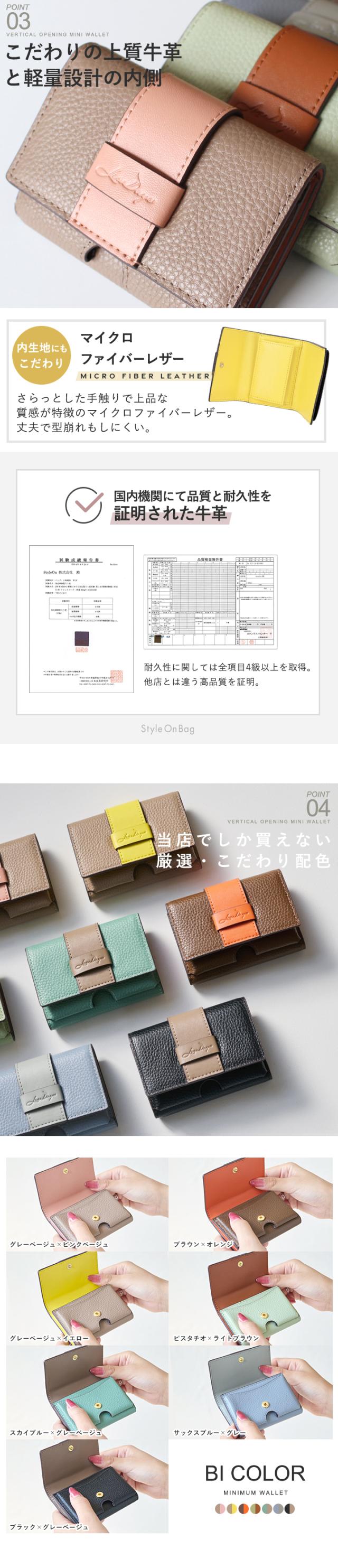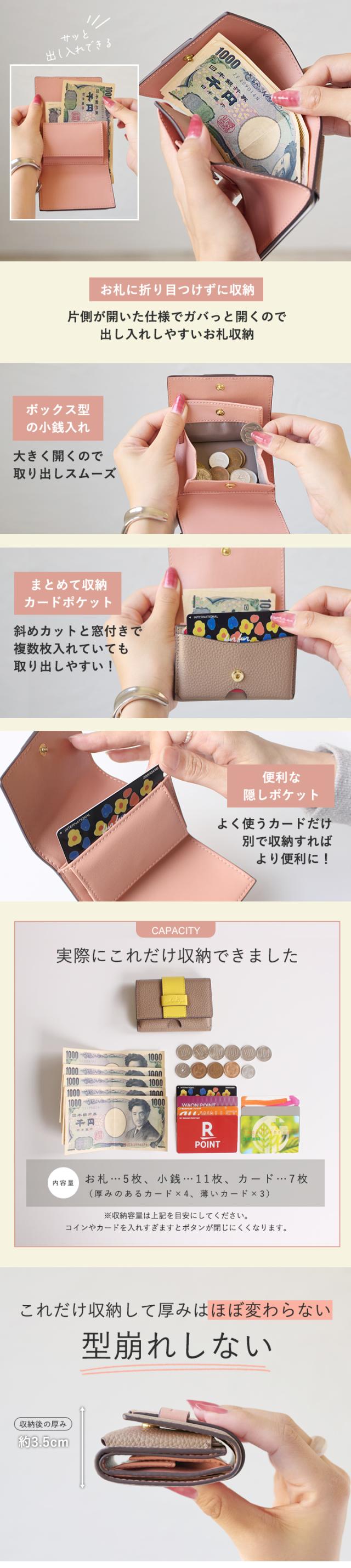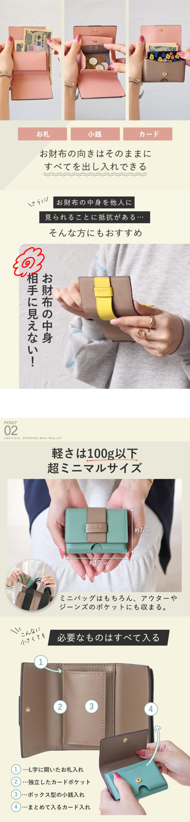 同じ向きのまますべて取り出せる「時短ミニ財布」 タテに開く、すっきりシンプル設計のお財布。 お札はL字に開いたポケットで折り目をつけずに 収納、横にズラすだけで出し入れスムーズ。 ボックス型の小銭入れは見やすく零れ落ちない。 カードは1つのポケットにまとめて収納。 小銭入れの背面に独立したカードポケットも あるのでよく使うカードはそこに入れると便利。 手のひらに収まる超ミニマルサイズでどこへでも 持ち運べる。配色可愛い上質な牛革アイテム! |