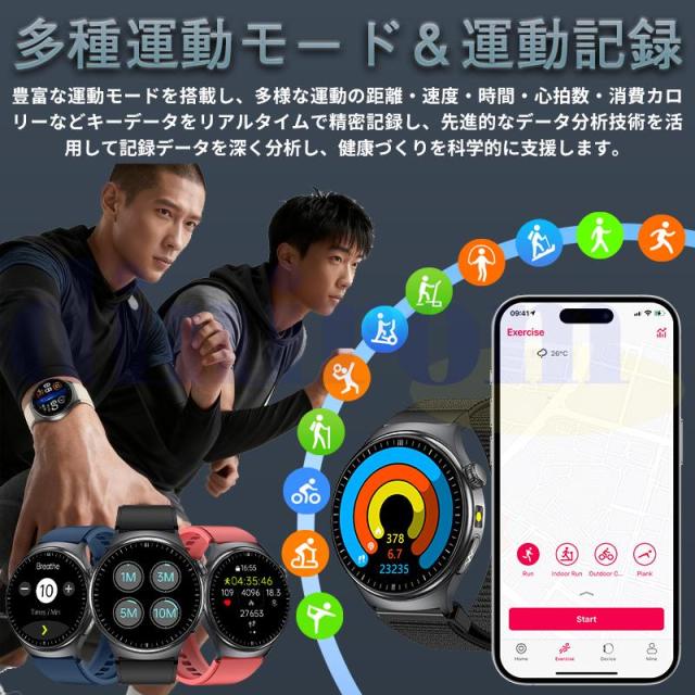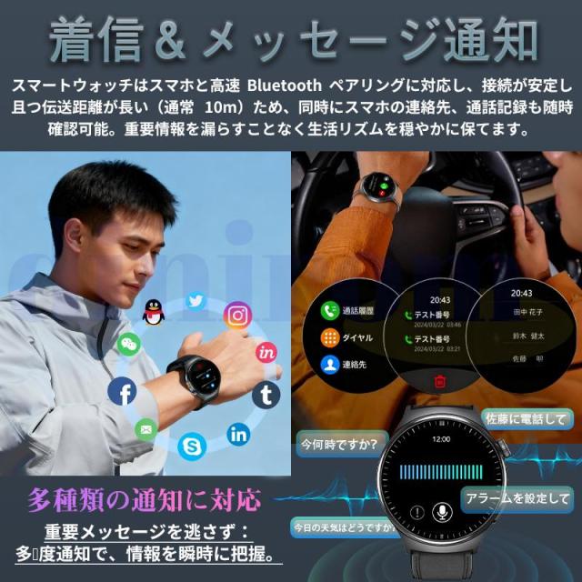 【Bluetooth5.1通話機能&音声アシスタント】スマートフォンとBluetooth接続すれば、電話の受信と応答を行うことができます。大切な電話を逃すことはありません。※※専用アプリと接続するとス マートウォッチで直接に電話をかけることや着信拒否も実現可能。運転中でも運動中でも両手を解放し、より効率的な通話ができます。音声アシスタント機能を搭載しており、スマートウォッチに話しかけるだけで音楽をかけてくれたり、アラームを設定してくれたり、スポーツモードを開始したりするなどの操作を実行できます。