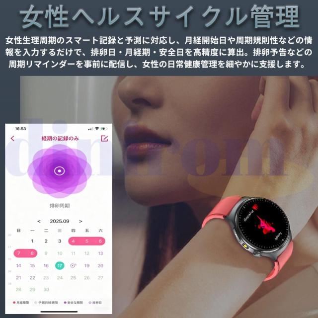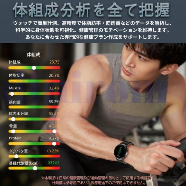 ●24H健康管理:血液成分、体組成分析、ECG心電図、24時間体温監視、血圧測定、血中酸素、睡眠監視や心拍数などの測定機能付き