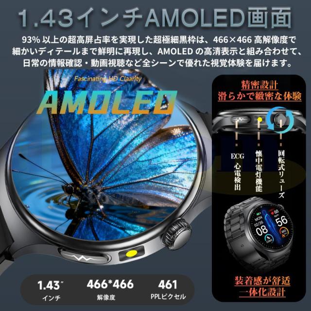 【1.43インチ大画面&多種類文字盤】HDの明瞭さで、健康とフィットネスの重要なデータを確認してください。3Dガラスの工芸に合わせて、より高い解像度の視覚体験とスマートフォンのようなタッチ触感を楽しめ、もっと便利に操作することができます。例のない快適な視覚感と優れた操作感をもたらし ます。多国の言語を自由に設定できます。更に、文字盤DIY機能もあり、携帯電話中の写真を利用して、お好きな文字盤を作る事もできます。毎日のお気持ちによって、新たな活力を注ぎます。好きな文字盤スタイルを取り替えましょう。