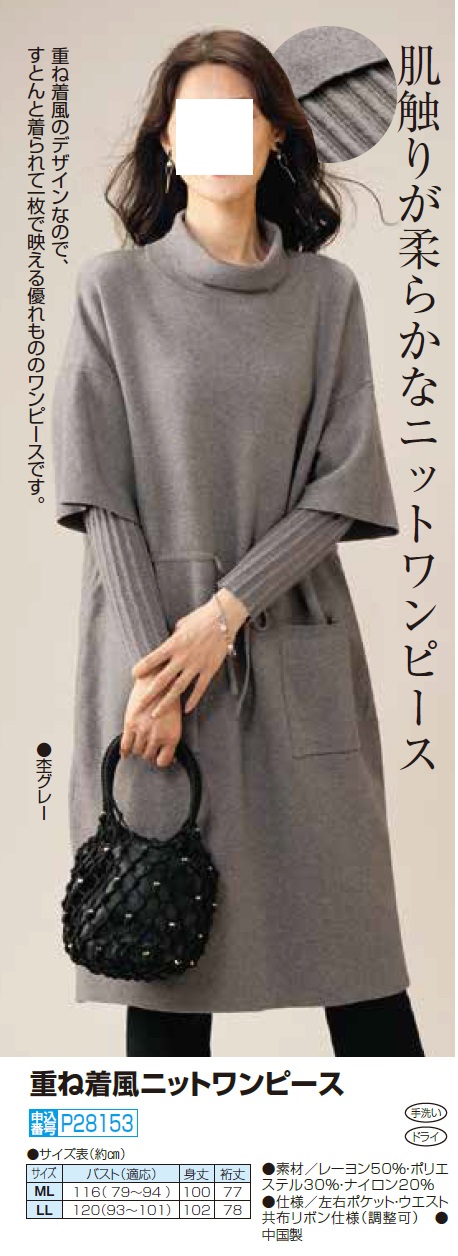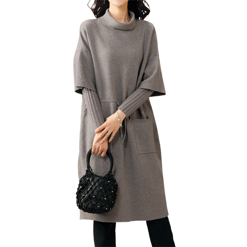 重ね着風ニットワンピース 杢調 グレー ワンピース ひざ丈 ハイネック タートルネック レディース 婦人服 ミセス シニア 女性 大人 膝丈 レイヤード風 無地 シンプル オシャレ シニアファッション 40代 50代 60代 70代 80代 90代 母の日 お母さん 秋冬 nss p28153