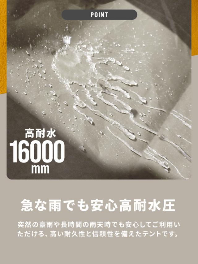 | 注意事項 | ・テント生地には撥水加工が施されていますが、雨天・豪雨下での完全防水を保証するものではございません。