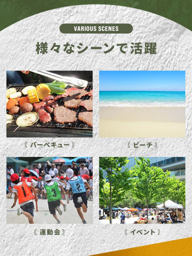 急な雨が降っても安心の撥水加工が施されており、大人数のバーベキューやスポーツ観戦、アウトドア、休憩所にぴったり。
