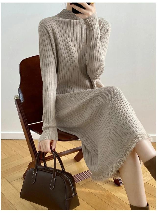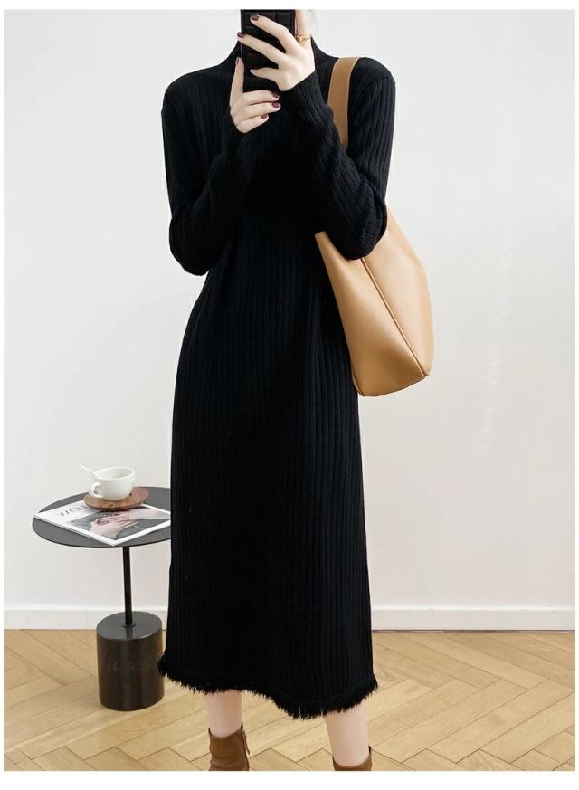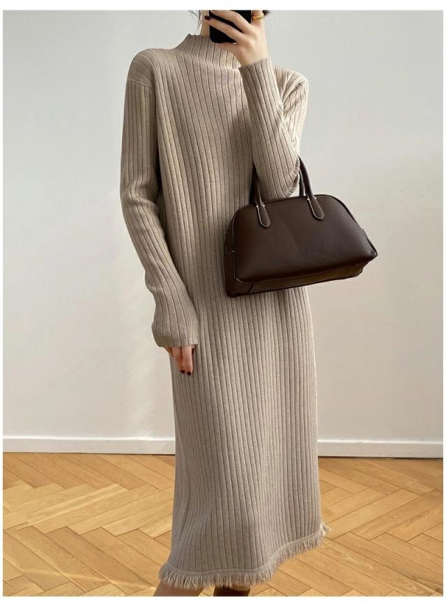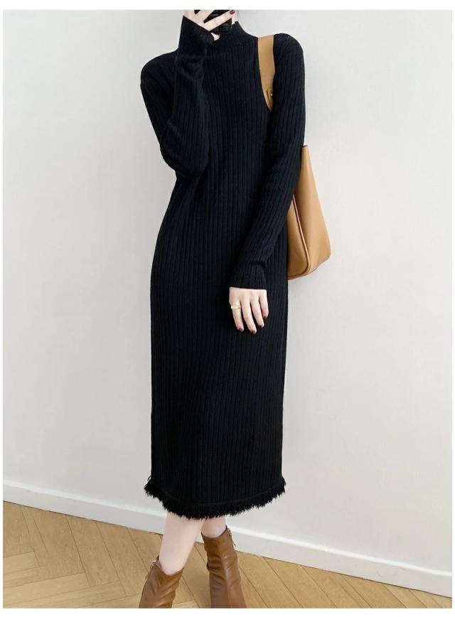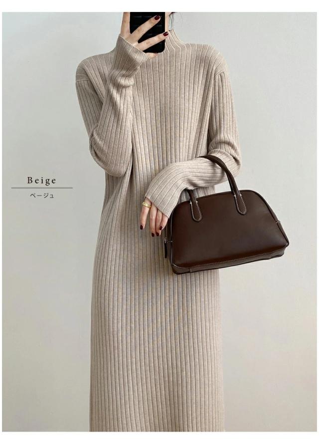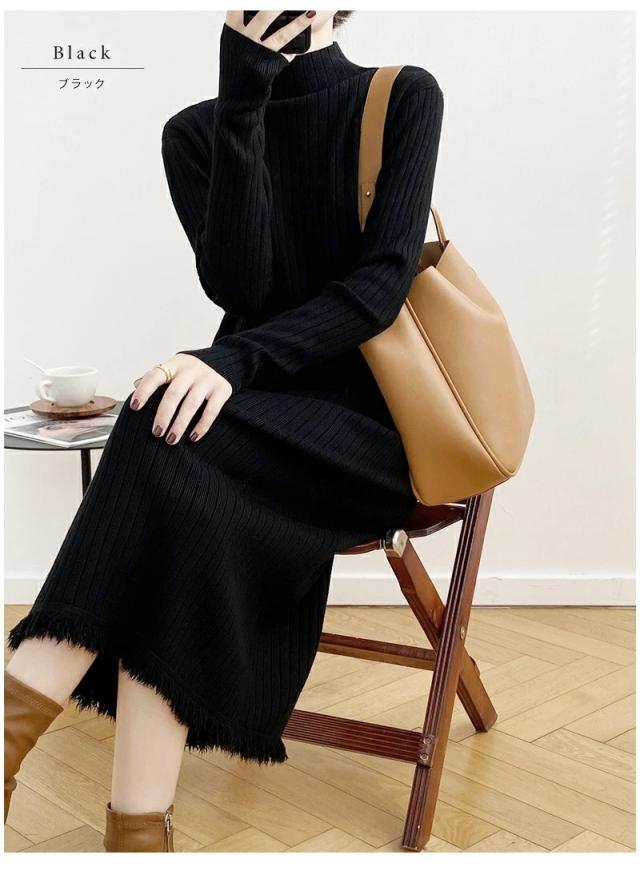 ニット ワンピース 秋 冬 レディース リブ フリンジ Iライン マキシ ロング ハイネック ワンピース 長袖 秋冬 ニット 長袖ワンピース 大きいサイズ 無地
