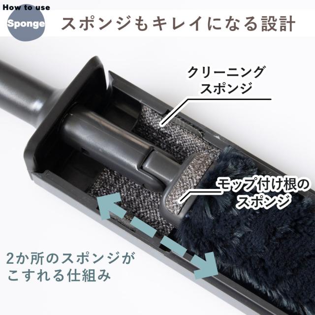 ケースとモップ付け根のクリーニングスポンジをこすり合わせることで、目に詰まったホコリを取り除くことができます。