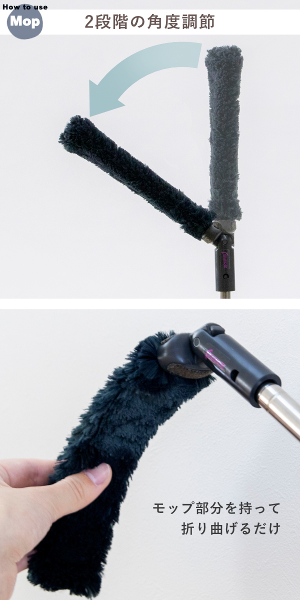 モップ部分を折るだけで角度を固定可能。掃除する場所に合わせて最適な角度で使用できます。