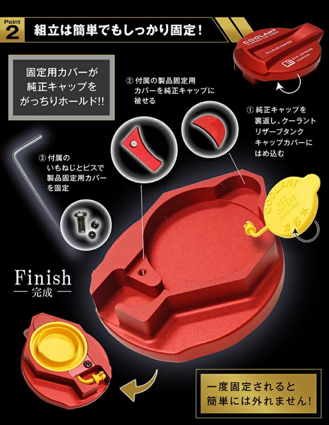 クーラントリザーブタンクキャップに被せて取付! 愛車のワンポイントアクセントにいかがですか? カラーは赤/青の2色から選択可! |
