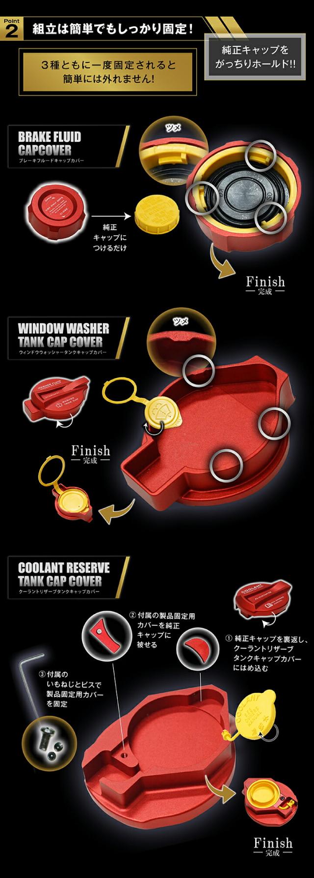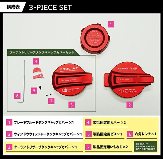 ■ブレーキフルードタンクキャップカバー 1個 ■ウィンドウウォッシャータンクキャップカバー 1個 ■クーラントリザーブタンクキャップカバー 1式 ・製品本体 ・製品固定用カバー 2点 ・L字レンチ ・製品固定用ビス ・製品固定用いもねじ |