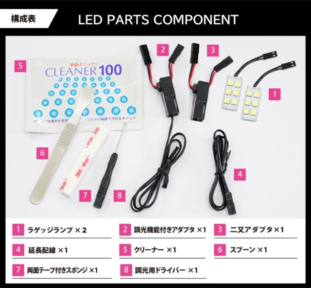 ・ラゲッジランプ 2点 ・調光機能付きアダプタ 1点 ・延長配線 1点 ・両面テープ付きスポンジ 1点 ・クリーナー 1点 ・調光用ドライバー 1点 ・スプーン 1点 合計 8点 ※年式・グレードによっては装着できないこともあります。適合できな場所がありましたら無償で交換させていただきます。 ※寸法違い等の理由での返品や交換は一切致しませんので、あらかじめ取付け部の寸法をご確認お願いいたします。 |