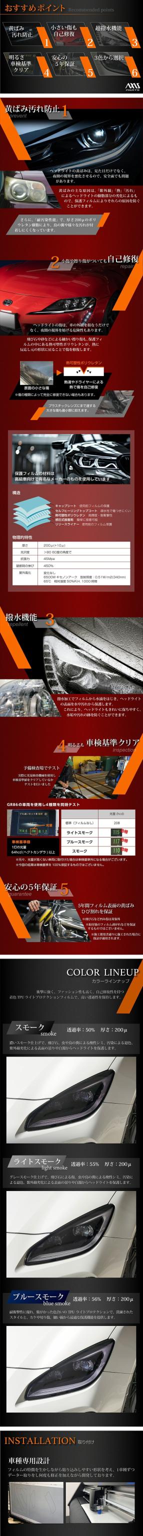 車種専用設計 カット済ヘッドライトプロテクションフィルム! 5年耐久のプロテクションフィルムを採用! 紫外線カット・撥水・高輝度・耐衝撃性 3色のフィルムカラーから選択可! 車検も適合しています!5年保証付き! |