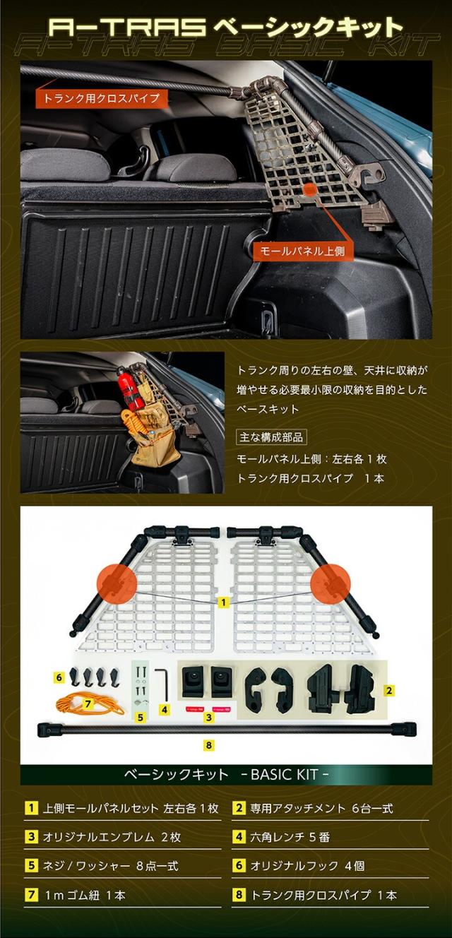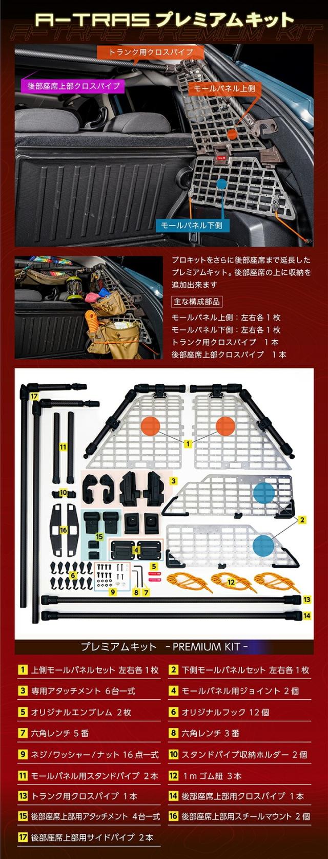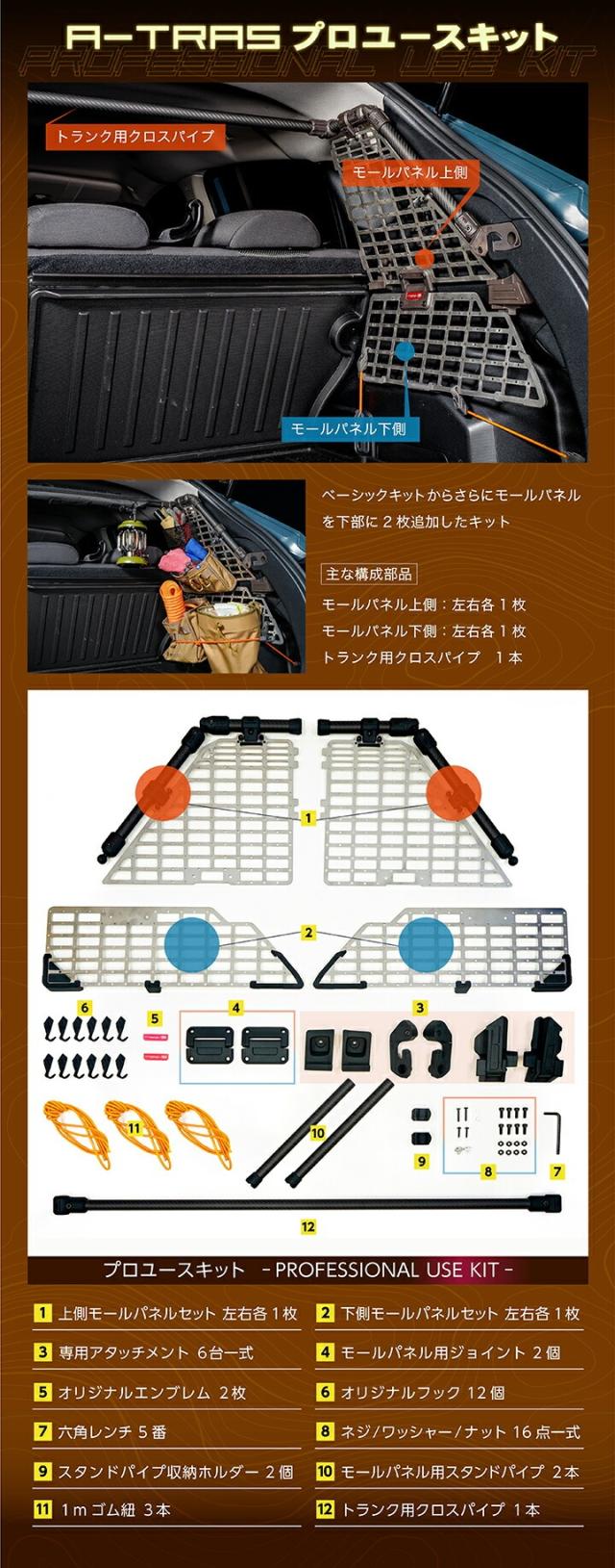 【Aセット(ベーシックキット)】 ・モールパネル上側 左右各1枚 ・トランク用クロスパイプ 1本 ・専用アタッチメント 6点 ・オリジナルエンブレム 2枚 ・六角レンチ 5番 1本 ・ネジ/ワッシャー 8点 ・専用フック 4個 ・1mゴム紐 1本 【Bセット(プロユースキット)】 ・モールパネル上側 左右各1枚 ・モールパネル下側 左右各1枚 ・トランク用クロスパイプ 1本 ・モールパネル用スタンドパイプ 2本 ・専用アタッチメント 6点 ・モールパネル用ジョイント 2点 ・スタンドパイプ収納ホルダー 2点 ・オリジナルエンブレム 2枚 ・六角レンチ 5番 1本 ・ネジ/ワッシャー/ナット 24点 ・専用フック 12個 ・1mゴム紐 3本 【Cセット(プレミアムキット)】 ・モールパネル上側 左右各1枚 ・モールパネル下側 左右各1枚 ・トランク用クロスパイプ 1本 ・後部座席上部用クロスパイプ 1本 ・後部座席上部用サイドパイプ 2本 ・モールパネル用スタンドパイプ 2本 ・専用アタッチメント 6点 ・後部座席上部用スチールマウント 2点 ・後部座席上部用アタッチメント 4点 ・モールパネル用ジョイント 2点 ・スタンドパイプ収納ホルダー 2点 ・オリジナルエンブレム 2枚 ・六角レンチ 5番 1本 ・六角レンチ 3番 1本 ・ネジ/ワッシャー/ナット 24点 ・専用フック 12個 ・1mゴム紐 3本 |