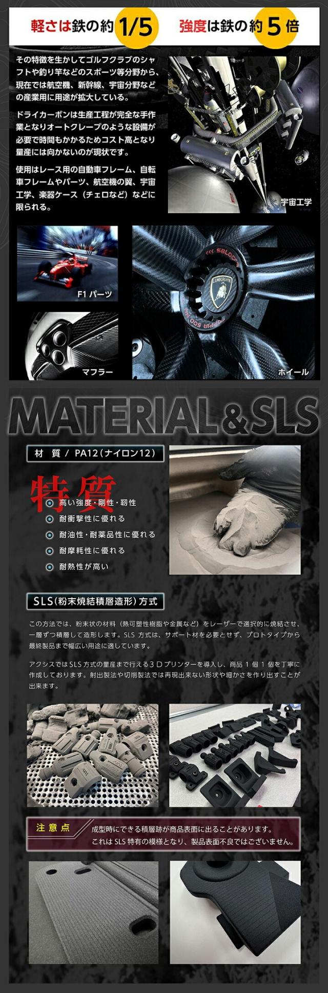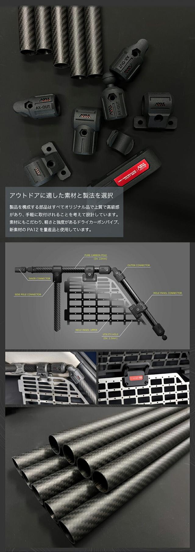 ・各パイプ:カーボン製 ・各ジョイント/アタッチメント:PA12(ナイロン12)製 ・モールパネル:ステンレス(SUS430)製 |