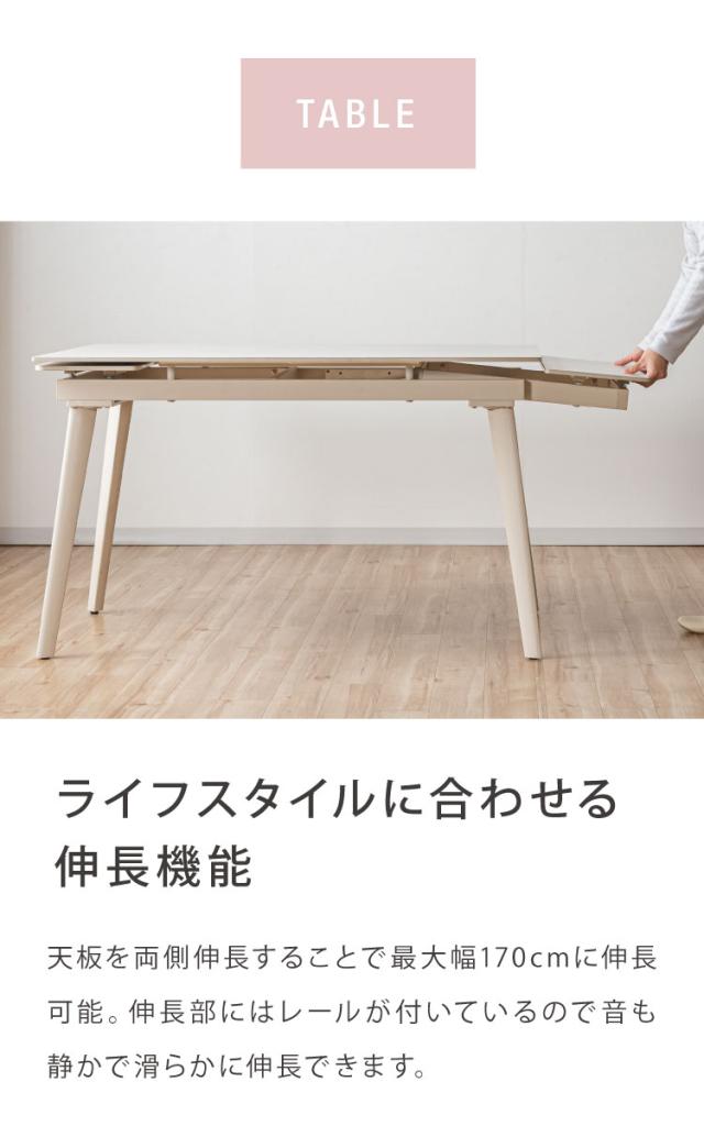【来客対応】:簡単操作で幅170cmまで伸長。最大6人掛けに対応し、急な来客やパーティーでも活躍します!